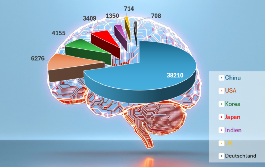 Obgleich Europa vor allem bei der wissenschaftlichen Schaffung und Etablierung von KI eine führende Rolle gespielt hat und immer noch spielt, erfolgt die Ernte der Früchte dieser Arbeit anderswo. Laut dem „Patent Landscape Report“ über „Generative Artificial Intelligence der Weltorganisation für geistiges Eigentum (WIPO) vom Juni 2024 sehen die effektiven Zahlen an KI-Patentanmeldungen so aus: